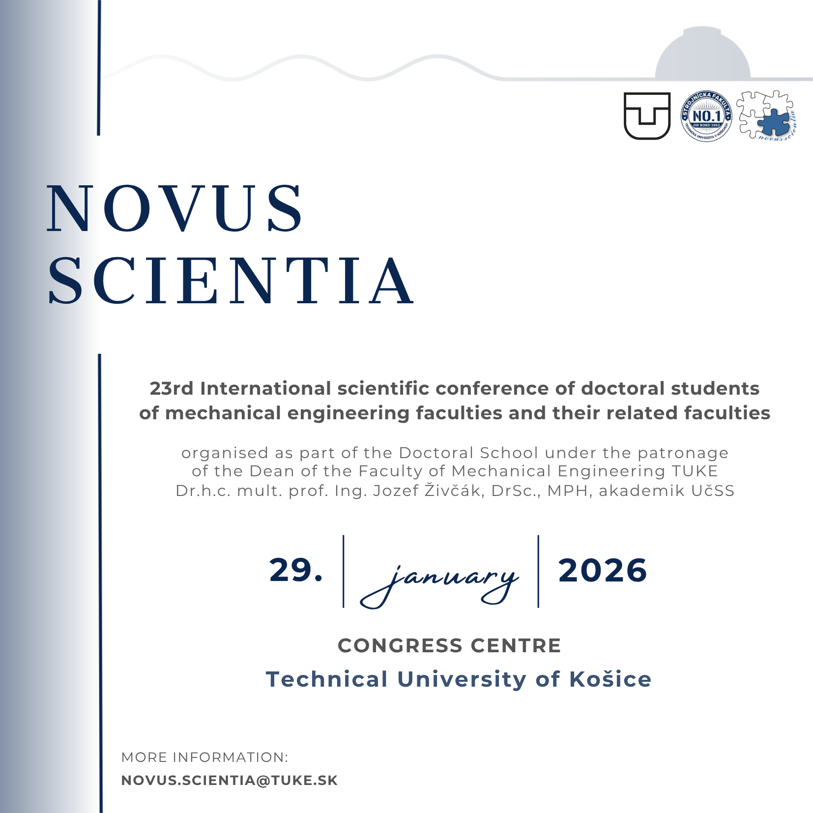 We are pleased to share an invitation to participate in the 23rd International Scientific Conference of Doctoral Students NOVUS SCIENTIA 2026, organized by the Faculty of Mechanical Engineering, Technical University of Košice (Slovakia) – a partner institution of Bialystok University of Technology within international scientific and educational initiatives.
