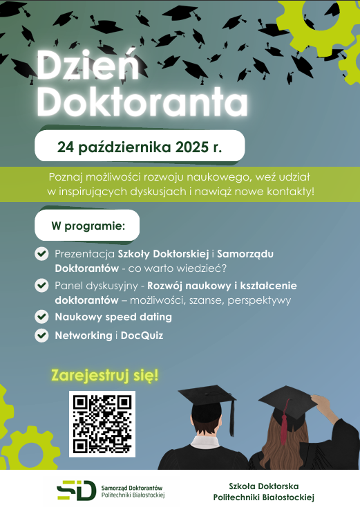 w imieniu Szkoły Doktorskiej Politechniki Białostockiej i Samorządu Doktorantów Politechniki Białostockiej i serdecznie zapraszam do uczestnictwa w Dniu Doktoranta, który odbędzie się w dn. 24.10.2025 r. (piątek) w Sali Rady Wydziału Mechanicznego w godz. 10:00 – 14:00.